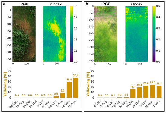 Yellowing index [%] for each GW based on the r index (r > 0.3). (a) North-facing GW and (b) south-facing GW. Images are presented for the date chosen as the reference image for early detection (14 December at the north-facing GW and 24 November at the south-facing GW). The last column in the south-facing GW (b) yellowing index (1 December) is lower than the image before (24 November), due to vegetation regrowth in part of the yellowed area.