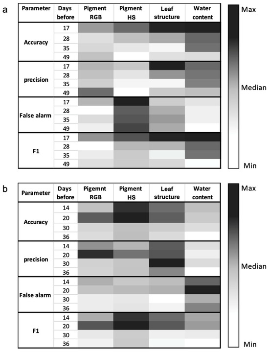 Maximum accuracy, precision, false alarm, and F1 score for each VIs group at the (a) north-facing and (b) south-facing GW. Each metric is colored based on the minimum value (white), median (gray), and maximum value (black).