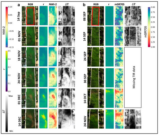 Time series of RGB images (left), the r index (middle left), the high-performance classifier (middle right), and ∆T calculated from the thermal image (right) for the (a) north-facing (212) and (b) south-facing (213) walls. The red frame is the ROI from which the time series of the VIs were extracted.