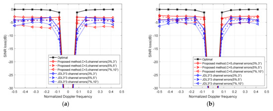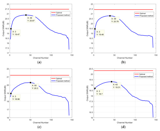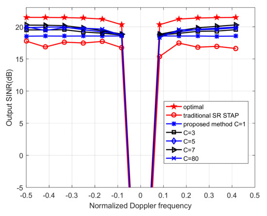 - A novel angular Doppler domain RD channel selection algorithm is proposed, which maximizes the output SINR as a criterion for selecting auxiliary channels. In general, suboptimal clutter suppression performance can be achieved by selecting 3–8 auxiliary channels using the proposed algorithm.