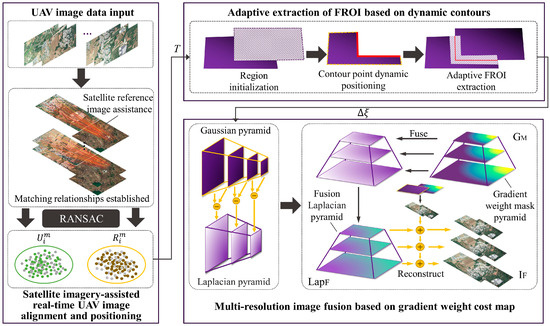 Workflow diagram of the seamless stitching technique for UAV fast-stitch image maps using satellite reference images. (1) UAV image data input. (2) Satellite imagery-assisted real-time alignment and positioning. Establish the matching relationship between satellite imagery and UAV imagery to help align UAV imagery and capture geographic coordinates. (3) Adaptive extraction of FROI based on dynamic contours. Construct dynamic contour point sets to locate gaps and adaptively extract FROIs. (4) Multi-resolution image fusion based on gradient weight cost map. Construct FROI with gradient weight cost map, perform Laplacian pyramid image fusion and incrementally stitch UAV fast-stitch map.
