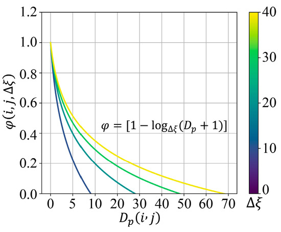 Figure 5. Heat map of distance factor calculation results. Different colors correspond to different values on the color bar. denotes the maximum value of the distance factor . The more yellow the color, the larger the . Different colors correspond to different values on the color bar; the more yellow the color, the larger the . - Weight normalization. The distance grayscale map obtained from the calculation is normalized; i.e., the distance value is replaced by a pixel value to achieve a smooth transition of the pixel value within the stitching seam , to obtain a gradient weight cost map of the image to be fused. The normalization process is as follows:where is the normalized pixel weight, is the weight function, and a graph of the weight function is shown in Figure 6. The larger the value of , the smoother the trend of the weights. is determined by both the distance factor and the adaptive factor , making the weights suitable for both limiting image detail loss and eliminating exposure differences. A schematic diagram of the normalized weight result is shown in Figure 7.