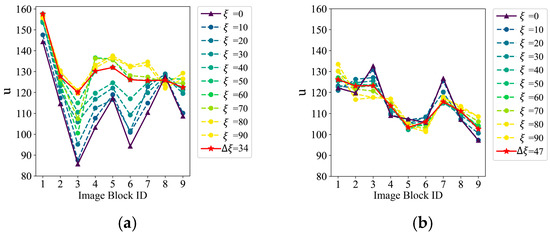 For the quantitative analysis, we used the mean grayscale line plot to evaluate the image fusion effect at different values of . We blocked the analyzed image blocks again uniformly and numbered them from top to bottom and from left to right; the blocking and numbering methods are shown in Figure 13. To further analyze the degree of uniformity of hue and exposure within the image, the within each block was calculated separately and a line graph was plotted. As shown in Figure 14, the horizontal axis indicates the block number, and the vertical axis indicates the of each block. The flatter the line, the more uniform the grayscale distribution within the image block and the better the fusion effect. As increases, the grayscale distribution line of the image block tends to become flatter, and the hue difference of the fusion image is smoothed compared to the grayscale distribution line of the original image (). There is a positive correlation between and the degree of fusion. However, when is increased to a certain threshold, the grayscale distribution folds of the image blocks tend to become more similar as increases. When using the adaptive calculated from Formula (4), the grayscale distribution of both data image blocks is flatter. This shows that can adequately meet the requirements of inter-frame fusion and the fused images have good grayscale consistency.