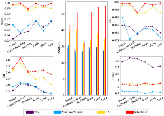The experiments were designed to verify the advantages of the proposed fusion method. We selected six pairs of images containing typical features as test data in two sets of experimental data. Comparisons were made with the weighted average fusion algorithm (WA), the maximum flow/minimum cut algorithm (Maxflow/Mincut) [17,18] and the Laplacian pyramid fusion algorithm (LAP) based on an OpenCV implementation. Of these, WA is the most commonly used image fusion algorithm, Maxflow/Mincut is a representative algorithm based on optimal stitching, and both the LAP and SatellStitch in this paper are based on FROI. The PSNR, SSIM, MI, CC and experimental time (Time) statistics for the fused image results of the four methods are shown in Table 2.