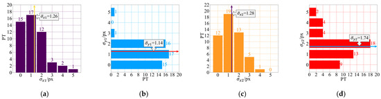 Statistical results of pixel errors in x and y directions of the UAV fast-stitch image maps. (a) Statistical results of pixel errors in x direction of Data I. (b) Statistical results of pixel errors in the y direction of Data I. (c) Pixel error statistics in the x direction of Data II. (d) Pixel error statistics in the y direction of Data II.