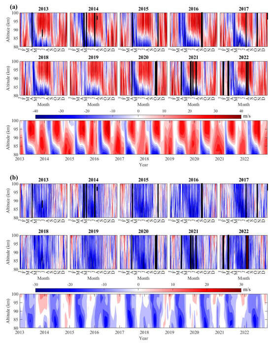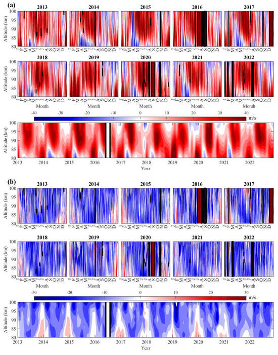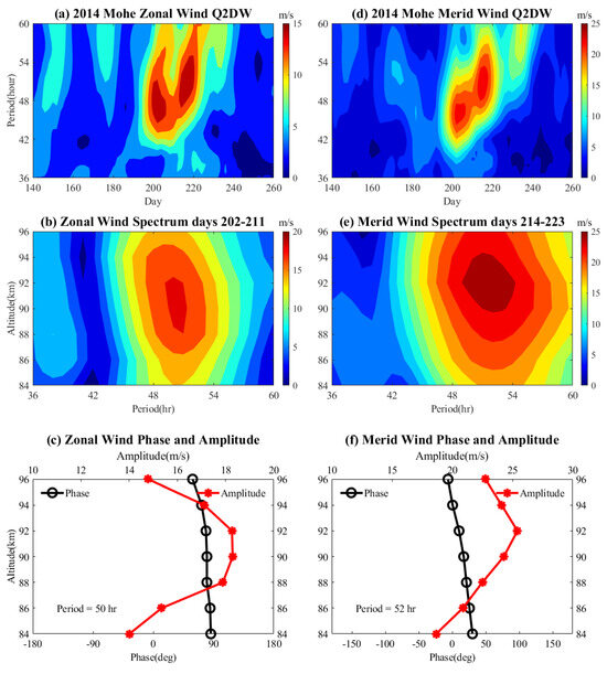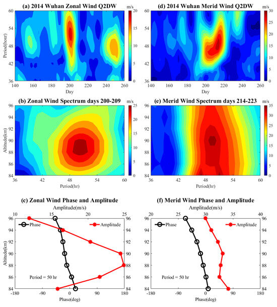 - Sun, R.D.; Gu, S.Y.; Dou, X.K.; Wei, Y.F.; Qin, Y.S.; Yang, Z.L. Decadal Quasi-2-Day Wave Observations in the Equatorial Mesopause Region by a Meteor Radar over Kototabang (0.2°S, 100.3°E) and TIMED/TIDI and Comparison with Quasi-2-Day Wave Observations at Mid-Latitudes. Remote Sens. 2023, 15, 1122. [Google Scholar] [CrossRef]