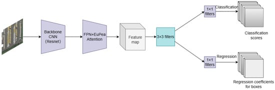 The feature extraction module utilizes Resnet-50 [] and FPN [] for the extraction of multi-scale features, facilitating the detection of objects of different sizes. Our module is placed after the FPN output, and we apply weight adjustments to the resulting features (see Figure 3).