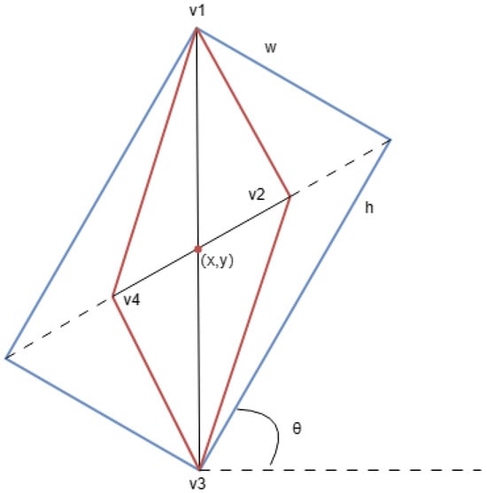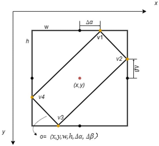 To represent anchor boxes in an oriented fashion, we utilize a novel approach referred to as “center point offset”, as depicted in Figure 5. The black dot signifies the center point of the horizontal bounding box, while the oriented bounding box, denoted as o, encompasses this bounding box. The orange dots denote the four vertices of the oriented bounding box. Specifically, we employ six parameters to describe the oriented bounding box . These six parameters enable us to compute the coordinates of the four vertices of each proposal, designated as . In this context, represents the offset of relative to the upper midpoint of the horizontal box. Due to symmetry, signifies the offset of relative to the lower midpoint . denotes the offset of relative to the right-side midpoint , and represents the offset of relative to the left-side midpoint . As a result, the coordinates of the four vertices can be expressed as follows: