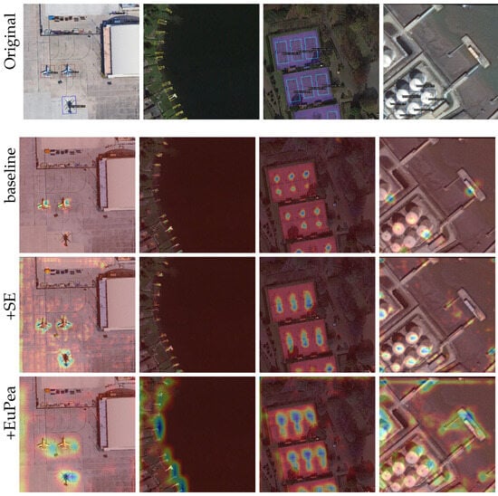 We integrated our attention mechanism into the baseline model, resulting in a notable, 1.0%, increase in mAP. The comparative results in Table 1 illustrate significant improvements in the detection rates for specific categories, such as “airplane” (+3.9%), “baseball field” (+2.1%), and “helicopter” (+11.3%), when compared to the baseline model.