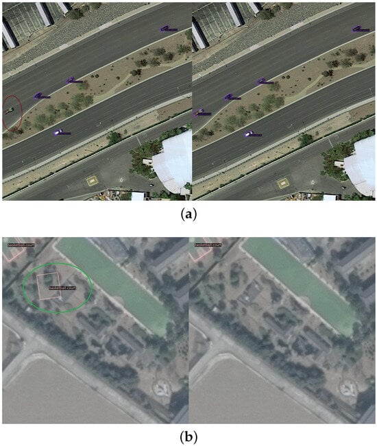 The impact of incorporating Euclidean distance attention into the model: (a) missed detection of small vehicles; (b) false detection of basketball court.