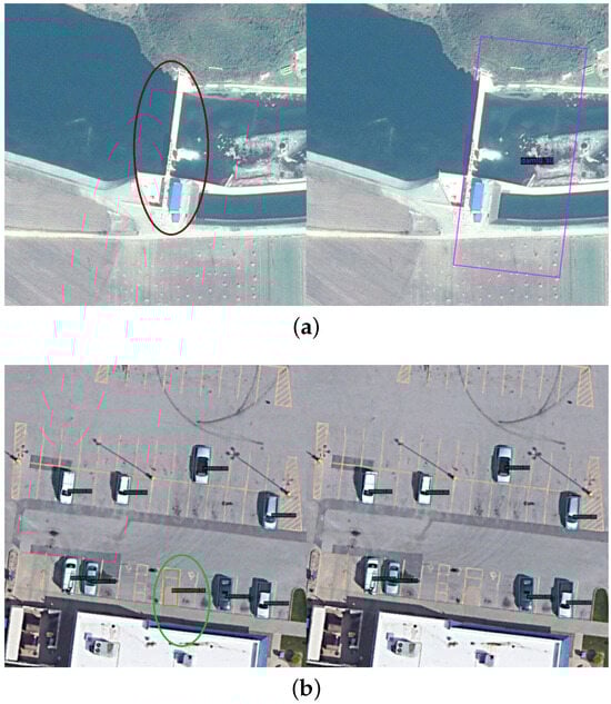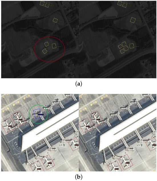For the DIOR dataset, we visualized the impact of the two modules on the baseline model. As illustrated in Figure 14 and Figure 15, the left side represents the baseline model, while the right side represents the model with the improved modules. In the figures, red circles denote missed detections, and green circles denote false detections. Positive detection results are illustrated in Figure 16.