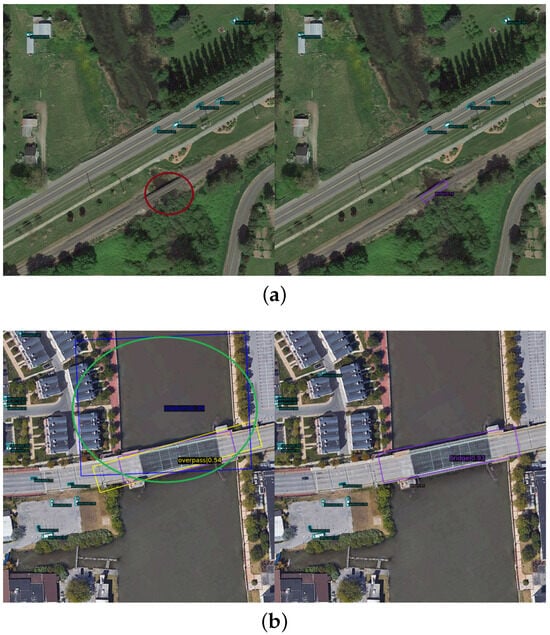 The impact of applying the Euclidean distance attention model to the baseline model: (a) missed detection of bridges; (b) false alarm of vehicle.