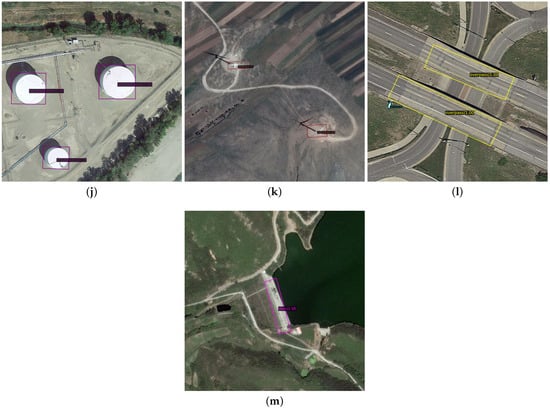 Visualization of the positive results: (a) airplane and airport; (b) basketball court; (c) vehicle and stadium; (d) golf field; (e) expressway service area and expressway toll station; (f) train station; (g) ship; (h) ground track field, baseball field, and tennis court; (i) chimney; (j) storage tank; (k) windmill; (l) overpass; (m) dam.