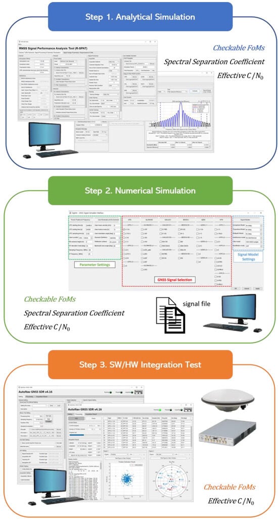 To overcome the limitations of the analytical and numerical approaches commonly used in compatibility assessments, ref. [14] proposed a step-by-step procedure for compatibility assessments, consisting of three stages, i.e., analytical simulation, numerical simulation, and software/hardware integration testing. The last step, software/hardware integration testing, involves the use of hardware devices for signal transmission and reception. It is significant in that it is the first approach to actually design and exploit a single-channel RNSS receiver, even in the signal design phase, thereby being able to test the tracking performance of the designed signal candidates. Early works in this regard [15,16] performed compatibility assessments using the step-by-step procedure to select navigation signal candidates for the new RNSS in the L6-band that was originally designed to cover the Korean Peninsular region. However, there are still limitations, in that the compatibility assessments were performed without considering satellite orbits, and the impact of existing RNSSs on the new RNSS cannot be assessed.