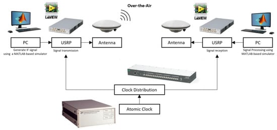 In order to validate the results obtained using the analytical and numerical approaches described in the previous sections, we need to assess the compatibility performance, taking into account the influence of hardware and channels. The experimental setup for the software/hardware integration test is shown in Figure 2, and the parameters that require additional definition are summarized in Table 8. The software/hardware test takes a long time to assess the compatibility for the location and time range considered in the analytical and numerical simulations. Therefore, in this paper, the evaluation is carried out by setting a specific receiver position and time for scenario 4 as an example of the assessment.