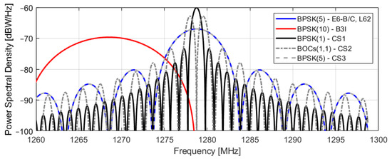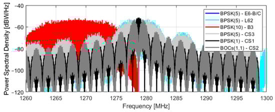 It can also be seen that there is a difference in the values of the self-SSC, even though the waveforms of E6-B/C and L62 are same, because the of the two signals is set differently. The SSC between B3I and the other signals is relatively low because it has a center frequency that is different from that of other systems in the same frequency band. Figure 3 shows the analytical PSD of the signals considered in the compatibility assessment, showing the spectral separation between the signals visually.