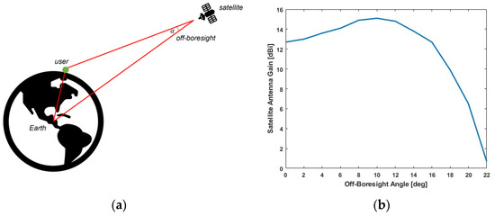 Satellite antenna gain according to the off-boresight angle for global navigation satellite systems (GNSSs): (a) definition of off-boresight angle; (b) typical antenna gain curve.
