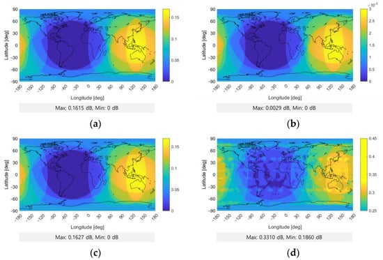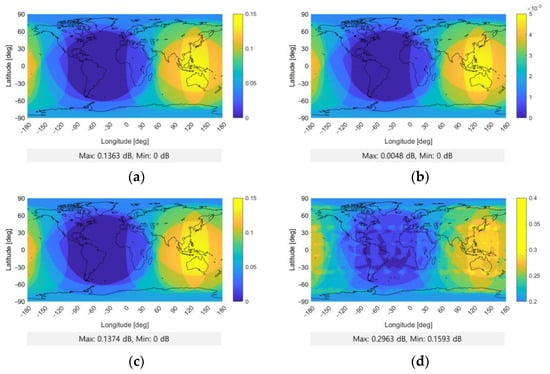 The results of the Figure 6, Figure 7 and Figure 8 show the following common characteristics. First, the patterns shown in the figures reflect the maximum aggregate power of the interference signals, which is proportional to the SSC results shown in Table 4. This means that the high results are derived when the SSC is high, and the low results are derived when the SSC is low. For example, Figure 6b shows the effect of the new RNSS interfering with BDS, and it has a relatively low compared to the other figures. This is because the BDS system has a relatively low SSC compared with the other signals, as it uses a different center frequency from other systems in the same frequency band. For the same reason, it can be predicted from Figure 6d that the interference effect of the BDS system on the new RNSS will be less than that of Galileo and/or QZSS. Second, a-c of the Figure 6, Figure 7 and Figure 8 have a minimum of 0 dB. This is because the new RNSS, which is an interference system, only serves some areas. On the other hand, d of the Figure 6, Figure 7 and Figure 8 has a minimum of approximately 0.2 dB. This is because some of the interference systems affecting the new RNSS provide services to users around the world to provide the PNT information at all times. Finally, the maximum in d of the Figure 6, Figure 7 and Figure 8 is relatively high compared to a-c of the Figure 6, Figure 7 and Figure 8 because, unlike the other scenarios, the three systems act as interference.