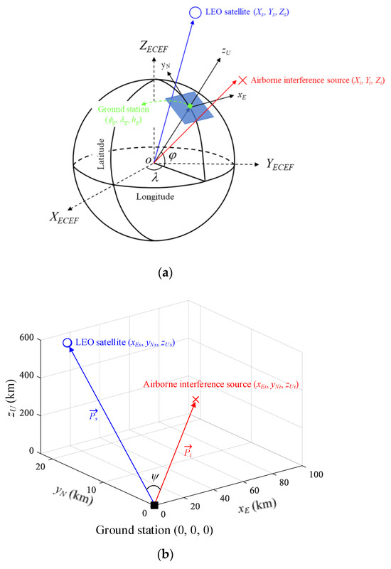 Schematic diagram for the conversion of the coordinate systems for the ground station, LEO satellite, and interference source: (a) conversion from WGS84 to the ECEF; (b) transformation from ECEF to ENU.