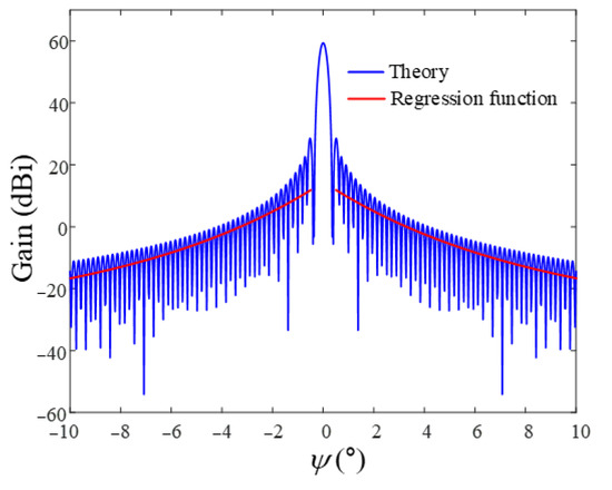Figure 3 shows the radiation pattern of a ground station antenna with a parabolic reflector and rectangular feed horn. The bore-sight gain (ξ = 0°) of the antenna is 59 dBi at 8 GHz. The blue solid line indicates the radiation pattern obtained using the GO and PO methods. The GO method is used to model the antenna, focusing inside the reflector, and the PO method is used to calculate the scattering on the reflector surface by considering the current distribution on the surface [15,16,17,18,19,20]. By combining these two methods, the ground station antenna radiation pattern can be calculated. The parabolic diameter of the ground station antenna is 11.3 m, and a feed horn antenna with rectangular aperture is employed. Since sidelobe gains exhibit large fluctuations according to angle, we apply a regression model in order to more easily observe the tendency of the J/S ratio. The regression model is based on the exponential Equation (9):
