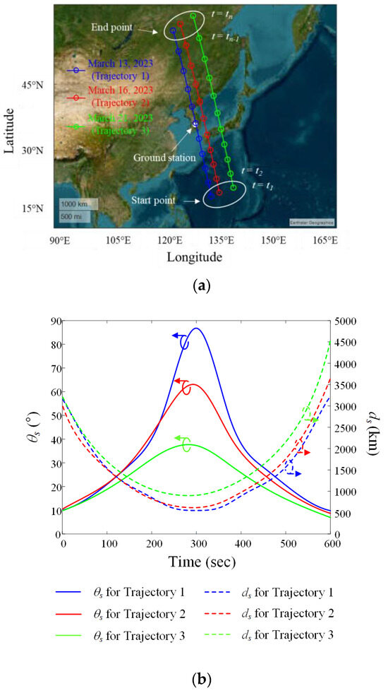 Figure 4a shows the satellite trajectories obtained from the TLE data. The blue, red, and green solid lines with circle markers represent the trajectories of the LEO satellite for 13 March (Trajectory 1), 16 March (Trajectory 2), and 21 March (Trajectory 3), 2023, respectively. The ground station is located at latitude 36.33° and longitude 127.26°. The time at which communication between this ground station and the LEO satellite begins is defined as t1, and the time when communication ends is defined as tn. In general, the data communication time is less than 600 s, so t1 and tn are defined as 0 and 600 s, respectively, in this scenario. Figure 4b shows the slant distance ds and elevation angle θs between the ground station and the LEO satellite for each trajectory. The maximum elevation angles of Trajectory 1, Trajectory 2, and Trajectory 3 are 86.8°, 62.7°, and 37.3°, respectively, and the slant distances from the ground station to the satellite at the maximum elevation angle of each trajectory are 550.9 km, 618.6 km, and 908.1 km, respectively.