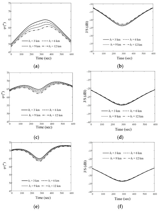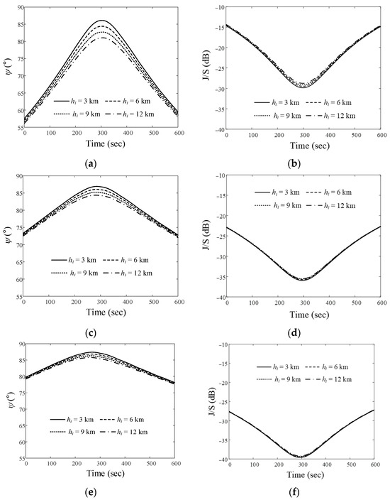 Relative angle difference ψ and J/S ratio results obtained by varying the altitude of the airborne interference source when the LEO satellite moves along Trajectory 3: (a) ψ for Path 1; (b) J/S ratio for Path 1; (c) ψ for Path 2; (d) J/S ratio for Path 2; (e) ψ for Path 3; (f) J/S ratio for Path 3.