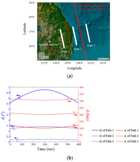 Figure 9a is for the case of Trajectory 3 (21 March 2023). The maximum elevation angles for Paths 1, 2, and 3 are 6.7°, 3.4°, and 2.2°, respectively, and the slant distances are 101.6 km, 201.7 km, and 301.9 km, respectively.