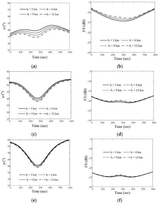 Figure 6a,b show ψ and the J/S ratio when the altitudes of the interference source in Path 1 are 3 km, 6 km, 9 km, and 12 km. The ψave values according to these altitudes are 73.2°, 72.2°, 71.2°, and 70.2°, respectively. The Jave/Save ratios for these altitudes are −22.3 dB, −22.1 dB, −21.9 dB, and −21.7 dB, respectively. Figure 6c,d present the ψ and J/S ratio according to altitude when the interference source moves along Path 2. For each altitude, the ψave values are 80.8°, 80.3°, 79.8°, and 79.3°, respectively. The Jave/Save ratios are −29.5 dB, −29.4 dB, −29.2 dB, and −29.1 dB, respectively. The ψ and J/S ratio when the interference source moves along Path 3 are illustrated in Figure 6e,f.