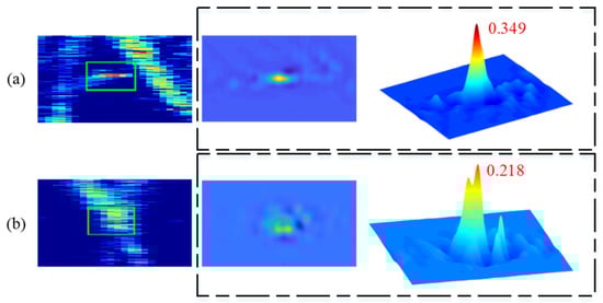 where represents the response map calculated by the correlation filter at frame , and and are the mean and standard deviation of , respectively. In cases where the tracking result is unreliable, as exemplified in Figure 3, the response map may exhibit multiple peaks with low values, resulting in a significant decrease in the PSR. Therefore, the PSR can serve as an indicator of tracking result quality to a certain degree.