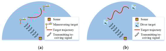 In order to solve the problem of weak target detection and tracking in low SRR, the methods commonly used at present can be categorized into three groups. The first group involves traditional data association methods, such as joint probabilistic data association (JPDA) [7,8] and multiple hypothesis tracking (MHT) [9,10]. However, these approaches suffer from high computational costs when confronted with a high false alarm rate. The second group focuses on methods based on random finite set (RFS) [11,12], which eliminate the need for data association. These methods employ filtering techniques based on the motion characteristics of the target. A crucial aspect of accurate tracking filtering is establishing an appropriate motion model that aligns with the target’s motion type. The filtering algorithms with multiple models (MMs) and the jump Markov system (JMS) have been shown to be effective approaches for maneuvering target tracking [13,14,15]. In addition, Yue et al. established a multi-directional motion model set according to the motion characteristics of the diver target [16]. However, due to the diverse underwater target motion types, it is challenging to apply a single modeling method to all underwater targets of interest. Furthermore, in environments with reverberation interference, the aforementioned tracking methods face difficulties in accurately determining the target’s position solely based on trajectory information. The third group involves deep learning methods, such as Convolutional Neural Network (CNN) [17], Recurrent Neural Network (RNN) [18], and Siamese Network [19]. These approaches typically require a substantial number of samples for model training. However, in practical applications, it may not be feasible to collect a sufficient amount of sample data.