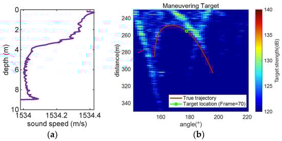 (a) Sound speed profile. (b) The actual trajectory of maneuvering target in acoustic image.