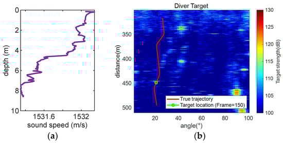 (b) Diver target: As represented in Figure 4b, the closed diver moves in a Z-shaped manner. The sound speed profile is shown in Figure 6a. The actual trajectory of the target is plotted in Figure 6b, represented by the red line. In this scene, the SRR surpasses 0 dB for the majority of frames, indicating a higher quality data set.
