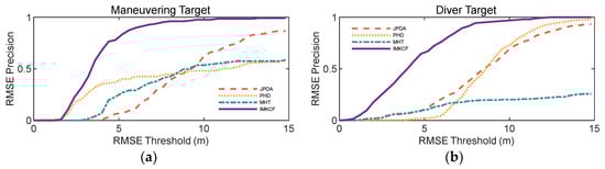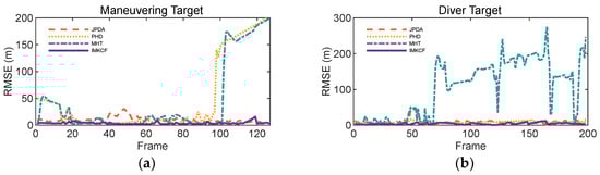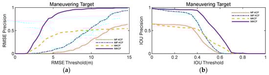 Figure 8a,b display the percentage of frames within a given RMSE threshold for the error between the estimated position and the true position of the maneuvering target and the diver target, respectively. Analysis of these figures demonstrates that the IMKCF algorithm outperforms the other three tested algorithms in terms of RMSE precision. Specifically, when the RMSE threshold is set at 5, the IMKCF algorithm achieves an accuracy rate close to 80%, while the other algorithms only have approximately 50% accuracy when the RMSE threshold is 10.