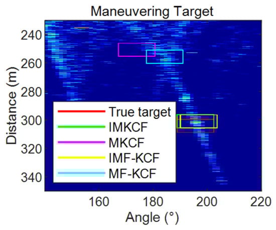 In this section, a comparative analysis is conducted between the proposed algorithm and three original KCF algorithms, namely, MF-KCF, improved MF-KCF (IMF-KCF), and MKCF. Figure 9 illustrates the target position in the final frame and tracking outcomes for all four algorithms. It can be observed from the figure that both the MF-KCF and MKCF algorithms fail to track the maneuvering target. Conversely, the IMF-KCF and IMKCF algorithms, incorporating adaptive reliability checks and a re-detection module, successfully track the target. At approximately the 70th frame, target tracking is interfered with by reverberation, and the training samples are contaminated, resulting in error propagation during model training and subsequent tracker drift. The IMKCF algorithm checks real-time reliability on target tracking results and re-detects the target position when deemed unreliable, preventing frame drift. The versatility of the re-detection module is demonstrated by its successful implementation in both algorithms.