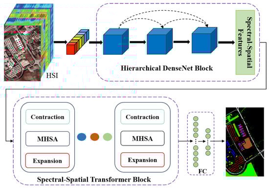 35] proposed exploiting a cascaded convolutional feature token to obtain joint spectral–spatial information and incorporate certain inductive bias properties of CNNs into the transformer. The densely connected transformer is then utilized to improve the characteristic propagation, significantly boosting the model’s performance.