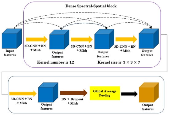 13] presented a two-branch SAS characteristic extraction network that employed a 1D-CNN for spectral characteristic extraction and a 2D-CNN for spatial characteristic extraction. The learned SAS information is linked and channeled into a fully connected (FC) layer, which extracts spectral–spatial characteristics to facilitate further classification. Yet, the 2D-CNN architecture could potentially result in the loss of spectral information within HSI. To proficiently capture SAS features, a 3D-CNN coupled with a regularization model has been proposed [