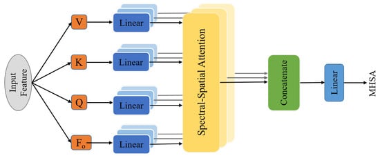 23]. Transformers are primarily composed of numerous self-attention and feed-forward layers that inherit the global receptive field, which allows them to efficiently establish long-range dependencies among HSI pixels, compensating for the lack of CNNs in global feature extraction. Hence, vision transformers have attracted widespread attention in HSIC, in which the MHSA serves as the primary characteristic extractor of the transformer for learning the remote locations of HSI pixels and global dependencies between spectral bands [