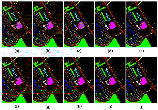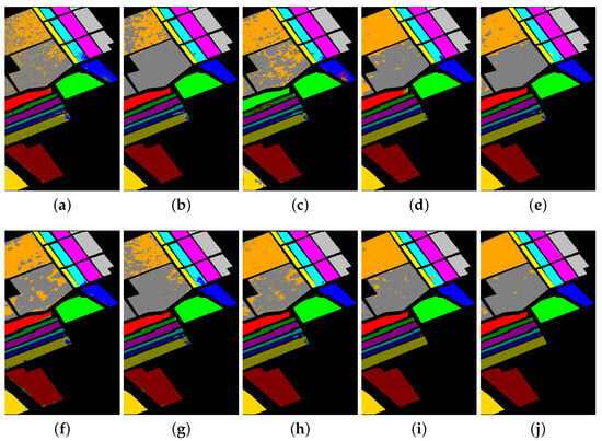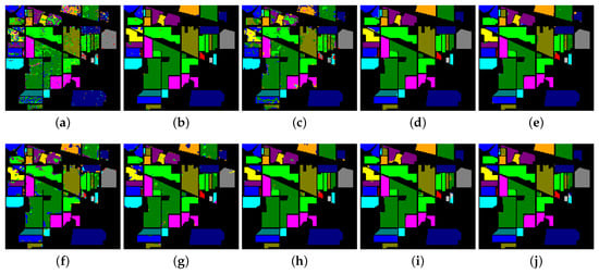 Figure 10. FDSSC, BS2T, and CNSST have relatively fewer misclassified pixels and better intra-class homogeneity, generating relatively smoother classification visual maps. Meanwhile, the visual maps of the other methods have relatively more misclassified labels and poorer homogeneity. This may be because FDSSC using 3D-CNN dense SAS networks with various kernel sizes can adequately capture different hierarchical levels of detailed information on spectral–spatial characteristics. Meanwhile, BS2T and CNSST not only exploit the 3D-CNN DenseNet’s ability to efficiently extract local hierarchical features, but also the transformer’s ability to model the long-range global characteristics of HSI pixels, and thus their categorization performance is better than FDSSC. In addition, the categorization accuracy of the proposed CNSST is 0.37% higher than BS2T, and CNSST has significantly fewer misclassification labels than BS2T in the lower left corner of the classification map. This is because BS2T employs a two-branch DenseNet structure to acquire the SAS characteristics of HSI separately, which fails to efficiently build up the correlation between SAS characteristics, and may result in the loss of characteristic information. However, the proposed CNNST employs a single 3D-CNN-based hierarchical DenseNet structure to capture SAS information simultaneously, which not only establishes a correlation between the SAS information of the HSI pixels, and obtains richer inductive bias and more discriminative spectral–spatial joint feature information; this information (inductive bias and contextual positional information) is also input into the transformer, which enables the model to be more positional-aware and spectral-aware. In addition, CNNST also utilizes the new Lion optimizer to boost the categorization performance of the proposed CNSST.