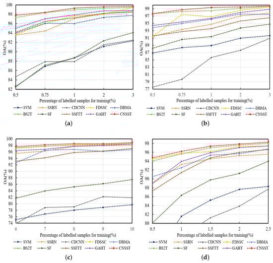 To further verify the sample sensitivity of the CNSST method, a comparison experiment of the different methods at varying sample proportions was conducted. In the experiments, labeled samples amounting to 0.5%, 0.75%, 1%, 2%, and 3% were randomly chosen from the UP and SV datasets for training. Similarly, 6%, 7%, 8%, 9%, and 10% of the samples were randomly chosen from the IP dataset. For the ZY dataset, 0.5%, 1%, 1.5%, 2%, and 2.5% samples were randomly selected. The classification accuracies of the various approaches with various percentages of training samples on the UP, SV, IP and ZY datasets are presented in