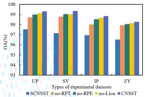 Figure 15, the CNSST approach achieves a significantly higher categorization accuracy than SCNSST, no-RPE, and no-RPT, which further demonstrates that CNSST with hierarchical DenseNet can adequately exploit the spectral–spatial joint characteristic information at various levels and acquire richer inductive bias information. Secondly, its introduction into the transformer with 2D-relative position encoding allows for a better characterization of the spatial position information of HSI pixels and strengthens the position-aware and spectral-aware capabilities of the model. Moreover, the spectral–spatial transformer with relative position encoding can effectively establish long-range dependencies between HSI pixels and enhance the feature extraction capabilities of the model. Moreover, the classification outcome of the proposed CNSST outperforms the no-Lion, which further demonstrates the effectiveness of the new Lion optimizer employed in this work in enhancing the model’s categorization performance.