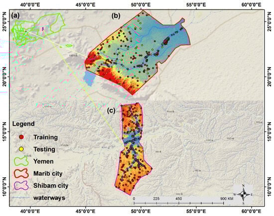 All related topographic and hydrological factors were calculated using DEM data. The rainfall data were prepared based on a dataset of 10 years (2010–2019) from the online source of NASA (https://power.larc.nasa.gov/data-access-viewer, accessed on 23 June 2021). The data were accessed and downloaded on 23 June 2021 (Table 1). The inverse distance weighting method in the Geostatistical Tool (ArcGIS 10.3) was used to produce the rainfall distribution map of the study area. The Renewable Natural Resources Research Center (RNRRC) produced Yemen’s national soil map in 2006 [60]. The soil map was rasterized, and the study area was derived and classified into three groups for the Marib city case study: Eft (sedimentary soils, dry sedimentary soils, and dry limestone soils), Ess (dry sandy soils), and Rtc (Dry soil, Sedimentary soil, dry limestone soils, and shallow soils). For Shibam city, the soil map was rasterized, and the study area was derived and classified into two groups: Etc (dry soil, dry sedimentary soil, soil dry, and limestone soil) and Rcc (dry limestone, soil dry, shallow calcareous soil, and shallow soil). Sentinel 2 (10 m) images, acquired in 2021 from (https://scihub.copernicus.eu, accessed on 6 April 2021), were used to produce the NDVI map. The land use of 10 m resolution was loaded from the website (https://livingatlas.arcgis.com/landcover, accessed on 26 June 2021). After the flood conditioning factors were prepared, they were converted to raster format. Due to concerns with pixel alignment, the projected raster function was utilized to ensure that the extents and projections of the 12 variables were matched and normalized. As a result, the factors were resampled to a grid size of 12.5 × 12.5 m, ensuring the elimination of inconsistencies in the spatial resolution of the conditioning factors and achieving a uniform spatial resolution [62], Figures S2 and S3 (Supplementary File).