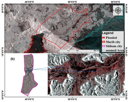 Flood detection by Sentinel-1 data of the study area. The location in Panel (a) is Marib City. The location in Panel (b) is Shibam City.