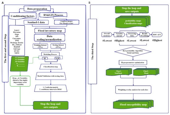 where a is the actual value, is the mean of the actual values, p is the predicted value of the model, and n indicates the number of observations. In this research, the analysis of flood susceptibility is meticulously conducted using ArcGIS 10.3, R 3.6.1, and the Sentinel Application Platform (SNAP 7.0). The flowchart illustrating the methodology utilized in this work is presented in Figure 3. It outlines three primary steps: (1) gathering and preparing the data, (2) enhancing the ML algorithm by applying a variable drop-off function, and (3) evaluating accuracy, optimizing hyper-parameters, and performing the mapping process.