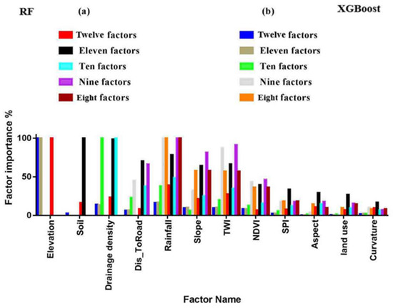 Compared to the Marib City, the maps produced by the two models with 10 factors are inaccurate. After implementing the drop-off loop, the function stops at nine factors. In Shibam City, the maps produced by the two models with 8 and 9 factors are inaccurate. After implementing the drop-off loop, the function stops at 8 factors. Although, throughout all periods, RF consistently outperforms XGB because it provides uniformity in the spatial distribution of the indices and avoids overfitting, the XGB model with 11 factors outperforms the RF model in Marib City.