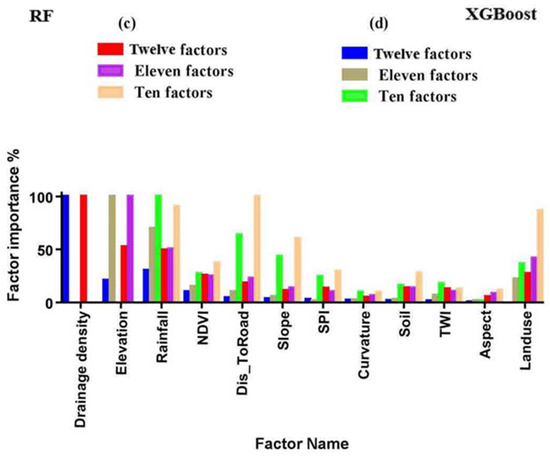 The drop-off function has been tested in two study areas to understand how it can effectively control overfitting and reduce uncertainty. Using the R tool, it is determined during the model training process how relevant each conditioning factor is for the models employed (Figure 4). In the RF model, drainage density was identified as the most crucial element for Marib city, followed by elevation, rainfall, land use, NDVI, distance to the road, soil type, SPI, TWI, slope, aspect, and curvature. In the XGB model, Dd was the most influential factor in determining the outcome for the same city. Rainfall, NDVI, elevation, distance to the road, slope, SPI, TWI, curvature, soil type, land use, and aspect followed.