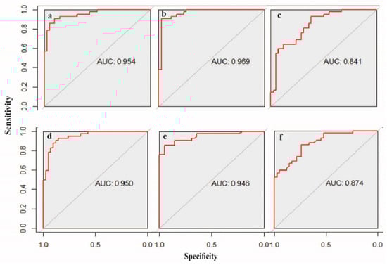 ROC plots for flood data (Marib City), produced according to the number of factors after each drop-off. Using XGB: (a) 12 factors, (b) 11 factors, and (c) 10 factors; using RF: (d) 12 factors, (e) 11 factors, and (f) 10 factors.