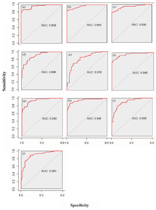 ROC plots for flood data (Shibam City), produced according to the number of factors after each drop-off. Using XGB: (a) 12 factors, (b) 11 factors, (c) 10 factors, (d) 9 factors, and (e) 8 factors; using RF: (f) 12 factors, (g) 11 factors, (h) 12 factors, (i) 11 factors, and (j) 10 factors.