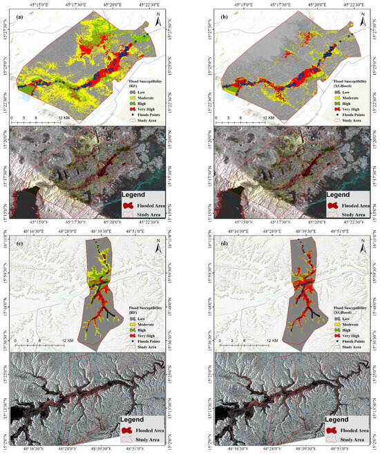 The flood susceptibility map produced by the RF (a,c) and XGB (b,d) methods in Marib City with 11 factors and Shibam City with 12 factors.