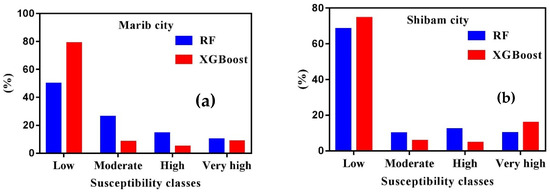 The flood susceptibility map generated by both independent and ensemble models employs a natural break classification to categorize areas with low, moderate, high, or extremely high susceptibility (see Figure 8). The susceptibility map generated by the RF model indicates that, in the case of Marib City, the proportions of the study area covered by the low, moderate, high, and very high susceptibility classes are 49.79%, 26.06%, 14.24%, and 9.89%, respectively. Similarly, for Shibam City, the corresponding proportions of the study area occupied by these susceptibility classes are 68.23%, 9.80%, 12.02%, and 9.93%, respectively. In the case of the XGB model applied to Marib City, the surface area proportions for each class are as follows: 78.66% for the low class, 8.08% for the moderate class, 4.83% for the high class, and 8.42% for the very high class. Similarly, for Shibam City, the respective proportions of the total surface area are 74.33%, 5.49%, 4.47%, and 15.69% for the low, moderate, high, and very high classes. These values are depicted in Figure 9.