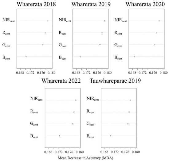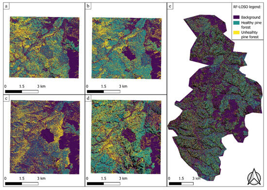 70]. The Green band was also important, although generally to a lesser extent than the NIR and Red ones, across the RF–LOSO models. The higher importance of NIR and Red likely reflects the reddening of the foliage during outbreaks before the needles are cast. The Blue band ranked the lowest in variable importance, with notably smaller MDA values across all models, but had similar MDA values to the other bands for the unhealthy pine forest class. In combination, the four-band product appeared to offer sufficient spectral discrimination between classes to allow for accurate classification and produced useful maps of disease outbreaks.